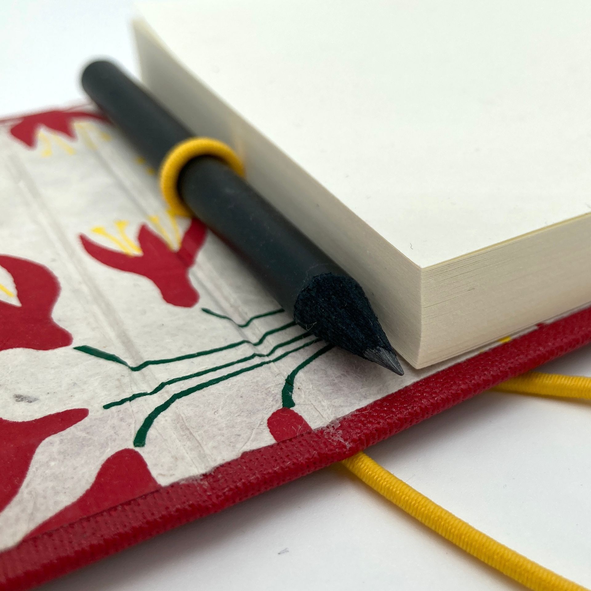 Der kleine Notizblock passt in jede Jackentasche, ein Stift ist mit dabei. Alles zusammengehalten mit einem praktischen Gummiband.